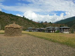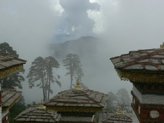 [Written by Cynthia Oct 8th, 2009] In some ways Bhutan seems like a much larger country than it actually is. In this small country there are 14 dialects and 16 different ethnic groups. It seems surprising that it developed a national identity centuries ago. It is likely that the strong spiritual practice of Buddhism is a major factor. Although it is less than 400 miles across the main transportation route, the east-west highway, it takes two full ten hour days to drive that distance. This drive is not for one subject to car sickness. The road has few sections that are straight for as much as 20 feet as if winds up and down through the mountains which cover most of the country. We found ourselves grateful to have arrived back in Thimphu just ahead of the recent unseasonable 30 hours of continuous hard rain. It is likely some of the road we just traveled has been blocked by landslides. Yesterday in traveling 2 hours to Paro, there were many large rocks and a few huge boulders on the road making travel hazardous. The only airport in Bhutan here in Paro was completely shut down yesterday and we are uncertain what it will take to catch up as only one airline with two planes flies into this airport. We are scheduled to fly to Kathmandu tomorrow and will wait and see if flights are back on schedule. As I write, the sky is clearing and I just saw a plane take off. We feel concern for trekkers in the mountains when this storm occurred. Hiking here involves crossing many streams and rivers, often by balancing on logs or jumping from rock to rock. Many of these temporary “bridges” many have washed away and some of the more permanent ones may be damaged. I am certain that the people living in the mountains will find ways to get trekkers safely down but it may take some time. As I look out my window there are already white sheets, towels and pillowcases drying on the line and things are getting back to normal.