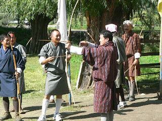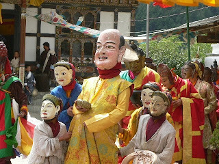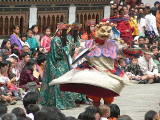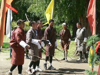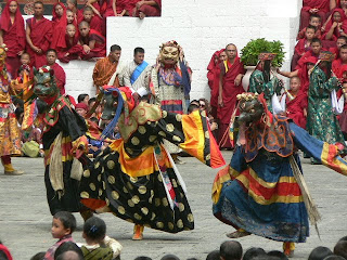 We arrived in Bhutan Monday afternoon the 21st. We touched down in the western town of Paro just an hour after an earthquake struck in eastern Bhutan, but didn’t hear any news about it until Wednesday. Apparently this was the most powerful earthquake in Bhutan since 1941. Over 1100 homes were destroyed and the death toll stands now at 13. Cynthia and I are fine. Tuesday was a holiday, the Rainy Day Festival, to celebrate the end of the monsoon season. Actually, the day was sunny and pleasant. It was a day for families to pack a picnic lunch and go out to watch archery and darts competition. Archery is the national sport of Bhutan. Men use traditional wooden bows and bamboo arrows. The target is placed 113 meters away and teams vie for the greatest number of hits. Whenever anyone hits the target (perhaps one out of twenty shots), the whole team stops to perform a little dance together in celebration. We spent two nights in Paro, then drove about 50 km to the capital city of Thimphu. Both towns are a welcome contrast to Kathmandu — nothing like the extremely crowded streets, the noise and the litter that dominates the Kathmandu scene. Here, you are struck by how neat and clean the streets are, the well kept homes and businesses and the prevailing quiet, even in downtown Thimphu. Kathmandu suffers immensely from the overcrowding, the unregulated over abundance of cars, trucks, motorcycles and vans, and the deterioration of the city due to the inability of the government to deal with any of the pressing social issues. In Bhutan, it’s clear that the leadership of a benevolent king has been crucial for maintaining a way of life, preserving Bhutanese culture, protecting the environment and cultivating a sustainable economy. The monarchy in Bhutan began in 1907 and there have been five kings since then. The fourth king, now about 55 years old has turned over power to his son, now 28. Last year the son relinquished his royal authority to a democratically elected government. The Bhutanese people were quite happy with the monarchy, but the fourth and fifth kings have made it their mission to educate their people about the benefits of a democratic system and have moved to install such a system to replace the monarchy. Prior to relinquishing power, the king set up an electoral commission, an autonomous commission with the power to investigate corruption, two legislative houses, and a supreme court. A constitution was drafted. Now the country is gradually learning how to use these new democratic institutions, while the king serves an advisory role only. Today was a special festival in which people dressed in the finest clothes and brought their families to the courtyard of the dzong where they watched monks perform a dance with elaborate costumes and masks. There were several thousand Bhutanese in attendance and a few dozen foreign tourists.