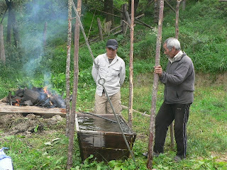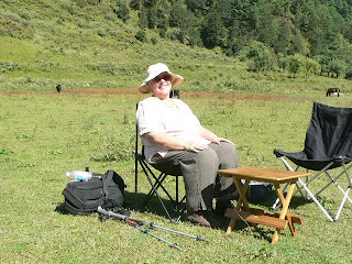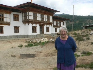 After three days of travel we ended up in a tiny village outside the small town of Jakar. As we drove through Jakar, it reminded me of a wild west town with small wooden storefronts on both sides of a narrow main street. Half of them were a General Store and Bar/Saloon. Virtually all of them advertised cell phone recharging cards. Across the road from our rural hotel was a small 14th century monastery. We spent most of two days at the festival there which had a very local flavor. The night before the festival the Lama came to bless each house (and our hotel) in the neighborhood after which a half naked monk dances through with a flaming branch. That completed, we walked down the road to a field in which a large circle of branches had been erected. The Lama’s completion of home blessings and arrival at the circle signalled the masked scantily clad monks to light the circle. The crowd of hundreds surged forward and began moving through the circle, a purification ritual. Next day the sacred ceremonies began at the monastery with rather bawdy clowns (monks) entertaining the crowds with wooden phalluses prior to the real cham (sacred dances) beginning. In the intimate atmosphere of this small monastery, we were able to see the costumes, masks and dances, musicians and locals’ reactions. These dances are often lengthy and intricate which gave us a great appreciation for the effort put into these ritual performances. We were amazed at the number and size of cameras at this event. I finally learned that a number of photography clubs from around the world had organized excursions. I wish they had paid more attention to honoring the local people and it’s significance to them. They came across as fairly self-centered groups. As interesting and colorful as it was, after 2 full days we were ready to move on and begin our trek. The first day was a pleasant walk through forest and fields, gaining a little altitude. Camp was set up in a field above a river which was inhabited by cows, horses and dogs. Nearby farmers were happy to porter tents, food and other supplies 3 km from across the river where the car was. This was camping like I had never experienced it before. There were folding chairs and a table and even a latrine tent and someone to cook our food. Wow! Because of the ongoing challenge of my knees, David thought having a horse in reserve was a good idea. Since there were horses already going over the pass carrying supplies for another group, this was no problem. My success the first day made me quite determined to cross the pass on my own two feet. Allieve at night and -Ibuprofon in the morning seemed a winning combination plus the aid of my hiking poles. The temperature was perfect, my shoes were comfortable and I was confident as we started climbing through beautiful forest of evergreens, rhododendrons, bamboo, and a diversity of plants we had never seen before. We wondered if David Hinkley had cataloged or propagated the plants of Bhutan. We continued to play leap frog with the farmers and group of horses and each time I was asked if I wanted a horse yet. Given that the saddles were uncomfortable wooden things and the path frequently very steep over large rocks and occasionally less than a foot wide with a precipice on one side, I felt far safer on my own 2 feet. It was a long way up and I was exhausted and very sore by the time we got to the pass. The prayer flags flying all around us immediately lifted my spirits as we shared lunch with Sangay, our very steady guide. He said it would be about an hour down to here our camp would be. Three hours later with dusk upon us, I dragged into camp, wanting only to wash up and sleep. After forcing down a bowl of soup, I did bask in my accomplishment. I did it on my own 2 feet and my walking sticks and with the support and encouragement of David and Sangay, both very patient men. It was a brief 2 hour hike the next day to a small very rustic house (actually the vacation home of the minister of agriculture) where we spent the next two nights. We also became acquainted with a Bhutanese tradition, the hot stone bath. Large stones are heated on top of a fire until they are white hot, then they are put in a wooden tub of fresh spring water. This steaming hot outdoor bath is very soothing after physical exertion. We are thinking of building one at Greenbank. The next couple of days we had shorter hikes to nearby dzongs and visited a nunnery which is under construction. As in China, I felt a completely different energy at the nunnery than I felt at the monasteries. We saw the small cell that 4 nuns shared and had tea with them. Some part of me would have liked the opportunity to spend a few days with them. The other still aching part of me realized that I would be useless in the hard work of construction that they were engaged in. Maybe on another visit. We are back in Thimpu, the only capital city in the world without so much as a single traffic light. In a few days we will be leaving Bhutan, but not without dreams of someday returning.